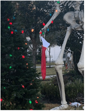 Fortunately, with a looming holiday just around the corner, the owners of that lawn attraction had another idea.  So they stuck a Santa cap on the skull, put a stocking in its bony hands, and added a Christmas tree beside it.  Voila!  Happy Holidays!